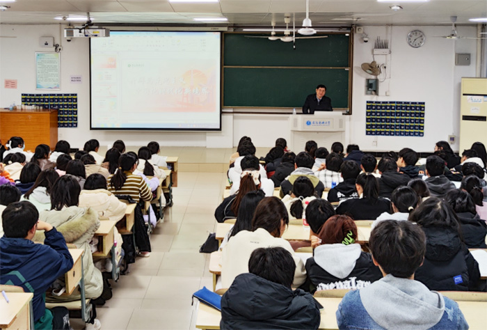 11月17日,校党委副书记谢瑞瑾在锡祺楼14201教室,为本科新生讲授了题为《开辟马克思主义中国化时代化新境界》的“形势与政策”课。
