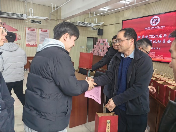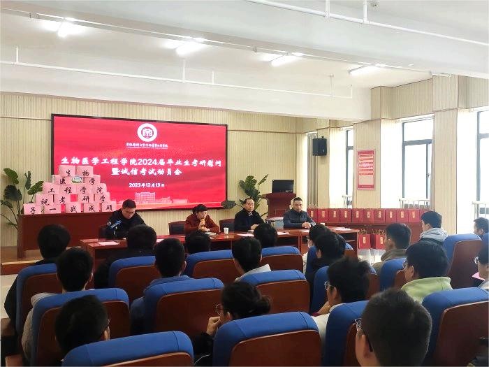 12月13日,生物医学工程学院举行2024届毕业生考研慰问暨诚信考试动员会。该院党委书记何婷婷、执行院长钱海生出席活动,院党委副书记周晓伟主持会议。与会院领导为同学们送上“一研成定”专属礼包,甜蜜温暖的寓意饱含学院对考研学子深深的关爱和祝福。