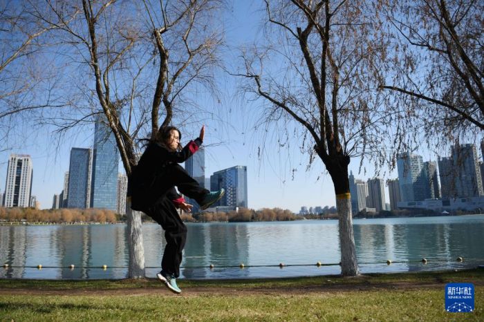 1月23日,章伯涵在安徽省合肥市天鹅湖畔练习太极拳。新华社记者 周牧 摄