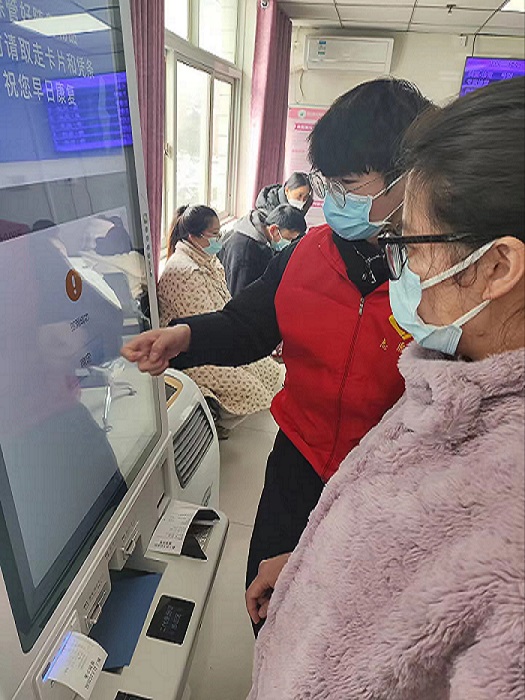 该院同学还结合自身所学积极走进家乡医院,开展导诊志愿服务活动。2023级生物信息学专业樊少琼同学进入颍上县人民医院北区参与导诊服务,协助患者挂号就诊和使用自助服务机,帮助行动不便的老年患者取药、陪同检查、取送检查检验报告单等,赢得了病患及其家属的连连称赞。