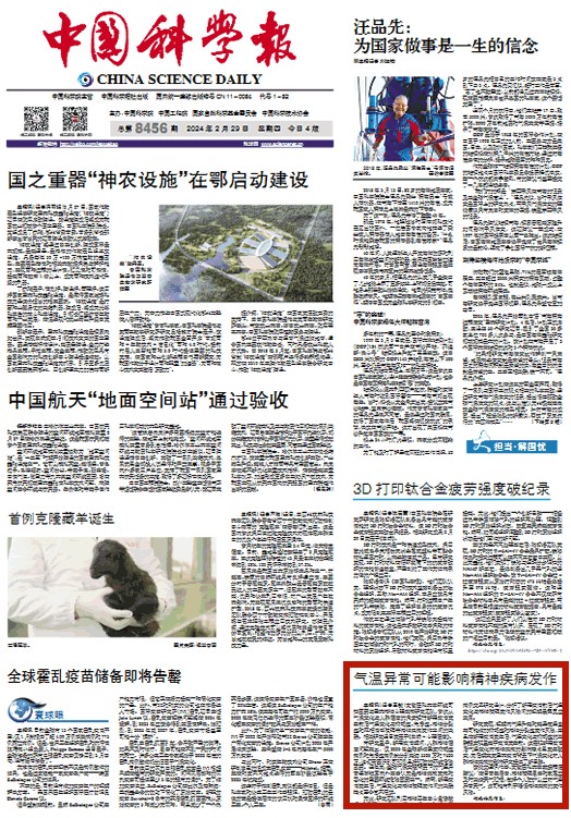 有研究显示,新冠肺炎疫情期间,人群精神健康问题突出,仅2020年全球新增重度抑郁症病例和焦虑症病例就分别高达5320万和7620万,迫切需要识别可预测且好预防的环境危险因素。近年来,全球气候变暖背景下的气温异常逐渐被国内外学者认为是精神疾病发病和恶化的重要环境危险因素之一。然而,新冠肺炎疫情发生后,气温变化与精神障碍发作间的关联特点至今尚不清楚。