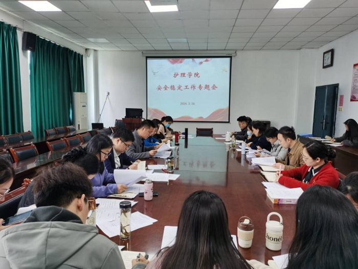 3月26日下午,护理学院召开安全稳定工作专题会,传达了学校安全稳定工作会议精神,集中学习维护校园安全稳定工作及校园安全文化节活动方案等相关文件。该院党委书记薛磊出席会议并与学院各职能部门、教研室(中心)负责人、辅导员代表签订了《安全稳定责任书》,院党委副书记王磊、副院长赵梅出席会议。