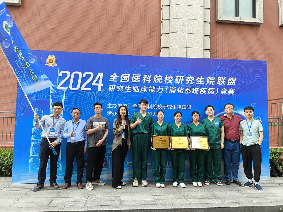 4月10日至12日,2024年度全国医科院校研究生院联盟临床能力(消化系统疾病)竞赛在广州举行。经过三天的激烈角逐,由我校第一附属医院消化内科专业赵梦雪、陈卓、朱亚雯、外科学(普外)专业孙浩楠、袁帅、田鹏飞(候补)6名研究生组成的参赛队,最终收获大赛团体二等奖、科研课题设计最佳风采奖、科普作品最佳人气奖三个奖项。