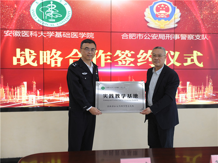 4月23日,基础医学院赴合肥市公安局刑警支队考察交流,签订战略合作协议并为实践基地签约揭牌。该院党委书记储兵、合肥市公安局刑警支队政委姚钧出席签约揭牌仪式,院领导班子成员、合肥市公安局刑警支队相关负责人参加座谈交流。