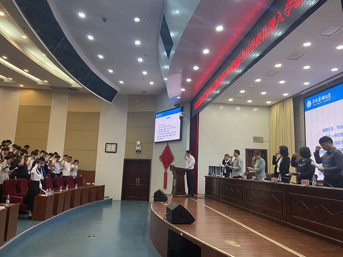 开学典礼上,口腔医学院副院长徐文华带领参会全体新生郑重诵读医学生誓词。邓雪飞、张驰分别作为教师代表和新生代表发言。典礼后,新生走进校史馆接受校史校情教育,大家纷纷表示要牢记党和人民的殷切嘱托,传承先辈遗志,弘扬党的优良传统,在攀登知识高峰中追求卓越,在肩负时代重任时行胜于言,用实干、担当、奋斗谱写绚丽的青春赞歌。