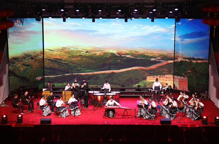 大学生仁心民乐团带来民乐合奏《金蛇狂舞》,二胡、琵琶等民族乐器齐上阵,生动刻画出庆祝节日时锣鼓喧天的欢乐场面。该民乐团和大学生室内乐团带来的室内乐演奏《圆舞曲》《阳光照耀着塔什库尔干》,通过东西方音乐元素的碰撞,将现场氛围推向高潮。大学生礼仪团带来的T台秀《启华夏 振中华》将一件件国风华服呈现舞台,彰显出华夏儿女的文化自信。