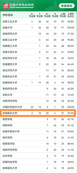 该榜单中,我校上榜专业总数达37个,其中,卫生检验与检疫、食品卫生与营养学、药物制剂、医学信息工程、健康服务与管理、助产学、康复治疗学、药学、护理学、公共事业管理等10个专业获评“A”等级,临床医学、眼视光医学、精神医学、麻醉学、儿科学、临床药学、医学影像学、医学影像技术、中药学、预防医学、智能医学工程、医学检验技术、运动康复、口腔医学、应用心理学、知识产权、生物技术、生物科学、信息管理与信息系统、法学等20个专业获评“B+”等级,法医学、生物信息学、生物医学工程、大数据管理与应用等4个专业获评“B”等级。