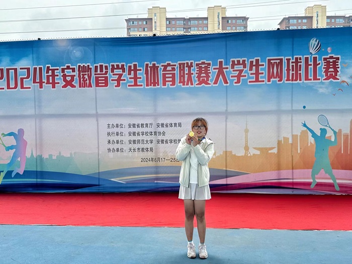 6月17日至6月25日,2024年安徽省学生体育联赛大学生网球比赛在安徽省天长市网球中心举行。我校第一临床医学院2022级麻醉专业仝书榕同学在女子单打比赛中勇夺金牌,实现我校在该项目上的历史性突破。