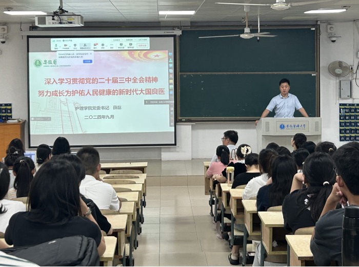 薛磊作了题为《深入学习贯彻党的二十届三中全会精神 努力成长为护佑人民健康的新时代大国良医的主题讲座。他表示,党的二十届三中全会对进一步全面深化改革、推进中国式现代化作出战略部署,同学们要将学习贯彻全会精神与学科专业发展、个人成长成才紧密结合,坚定理想信念,明确自身定位,做好学业规划,不断增强作为新时代护理人的使命与担当,努力成长为护佑人民健康的新时代大国良医。
