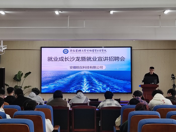 11月21日至24日,生物医学工程学院“医+x”就业成长沙龙持续推进,安徽皖仪科技有限公司、安徽福晴医疗科技有限公司相关负责人受邀参加,围绕“留皖就业”“行业对口就业”等主题向学院2025届毕业生进行宣讲。