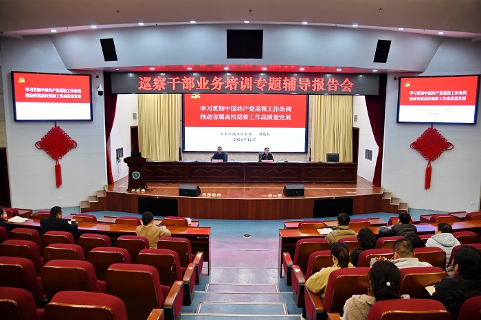 12月11日下午,学校在图书馆第一学术报告厅举办巡察工作专题辅导报告会,深入学习贯彻《中国共产党巡视工作条例》,提高巡察干部政治理论水平和业务能力。省委巡视办巡察处处长刘晓兵应邀作题为《学习贯彻<中国共产党巡视工作条例> 推动省属高校巡察工作高质量发展》的辅导报告,校党委常委、纪委书记、省监委驻校监察专员、党委巡察工作领导小组副组长黄新美主持报告会。