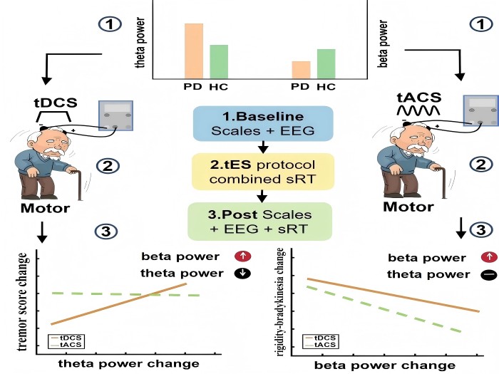 帕金森病(Parkinson's disease,以下简称“PD”)是一种以异常神经振荡为典型特征的神经退行性病变,常表现出震颤、僵直、迟缓等运动功能障碍。经颅直流电刺激(tDCS)和经颅交流电刺激(tACS),作为无创神经调控主流技术之一,在改善PD症状方面都显示出一定的临床潜力,但尚不清楚两种方法是否通过一致的神经振荡机制来调控PD的运动症状。