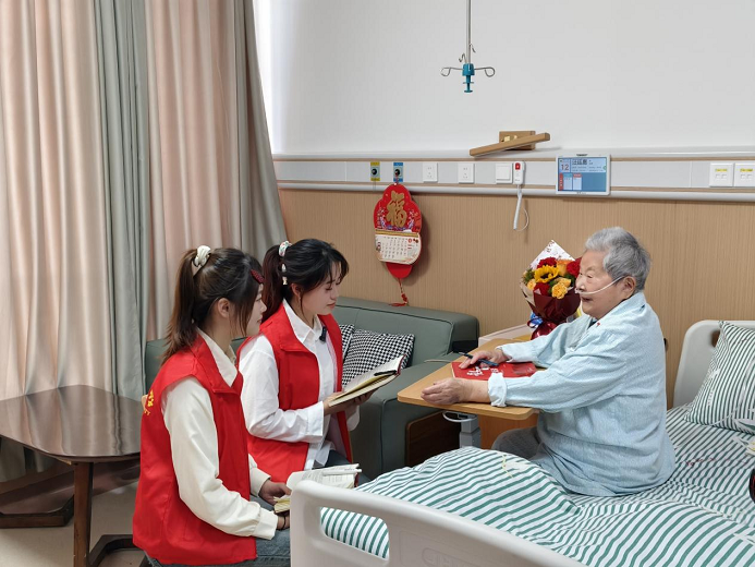 在合肥市第一人民医院(滨湖院区)医养结合病区,学院师生拍摄红色微党课,采访了四位平均年龄近百岁的老党员。94岁的汪奶奶曾从事党的宣传工作,回忆抗战岁月时她感慨:“年轻人要铭记历史,自立自强!”104岁的汪爷爷是渡江战役亲历者,他叮嘱学生:“入党是为人民服务,不是谋私利。”一对九旬党员夫妻的默契互动更令人动容——听力衰退的爷爷在奶奶“翻译”下分享革命故事。