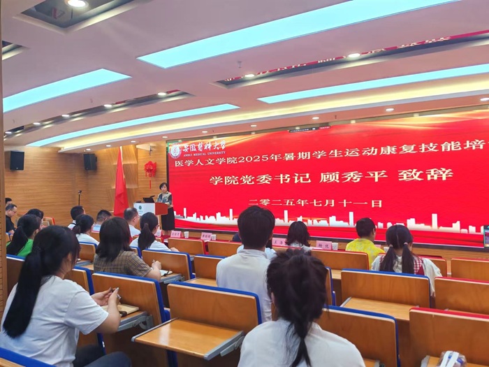 7月11日,医学人文学院在实验教学中心四楼会议室举行2025年暑期学生运动康复技能培训班开班仪式,学院党委书记顾秀平致辞,院长黄晓晖主持开班仪式。