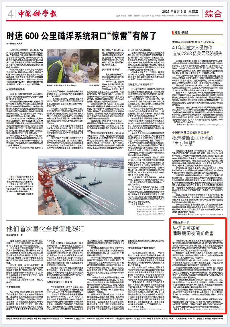 “数据显示,有3项以上早进食习惯者,睡眠期间夜间光危害效应降低60%至80%。”孙莹介绍,“调整进餐时间是一种可行的干预策略,尤其在无法完全避免夜间光污染的情况下,养成早进食规律可能成为保护代谢健康的重要措施。”