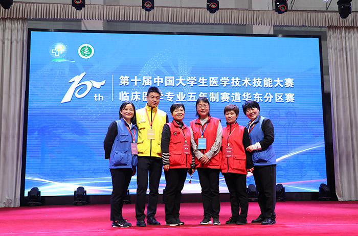 “我们注意到场上的选手为患者做了腹部触诊这一临床基本操作。虽然现在超声等影像学的床边检查工具在临床应用已非常广泛,但我们仍然不能丢弃像触诊这些最基本的操作训练……”4月11日,正在我校体育馆内进行的第十届中国大学生医学技术技能大赛临床医学专业五年制赛道华东分区赛决赛中,一位“只闻其声,不见其人”的女医生正在为线上观看大赛直播的人们解说着赛况。从初赛、复赛到半决赛、决赛的两天时间里,结合自身30余年的从医经验,她用洪亮的声音、生动的语言为大家带去了条理清晰、专业度极高的解说,也以评叙结合的方式再一次向医学生们说明了熟练掌握各种临床操作技能的重要性。
