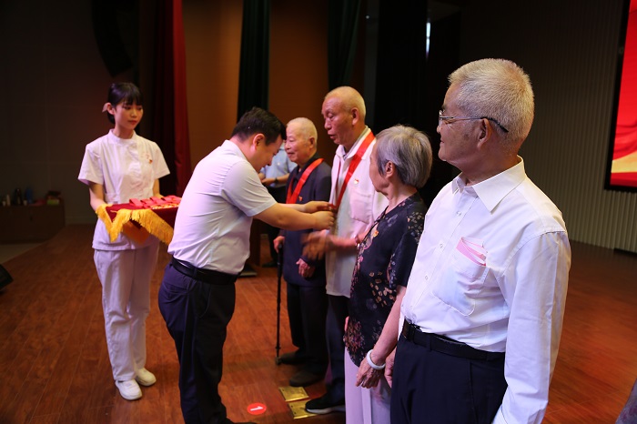 6月29日下午,附属亳州医院举办“光荣在党50年”纪念章颁发仪式暨“学党史守初心·传承沂蒙精神”党史学习教育专题党课。该院党委书记邓华,院党委副书记、院长郝树立为老党员同志颁发了“光荣在党50年”纪念章。