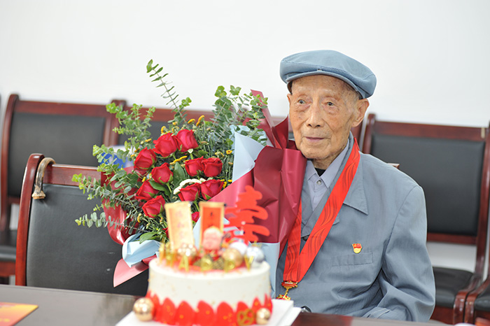 7月1日下午,我校离退休教职工党委的会议室里充满欢乐喜庆的气氛,我校与党同龄的百岁老战士、老党员徐亚球站在为他定制的百岁生日蛋糕前笑得十分开心,连连拱手向现场众人表达谢意。