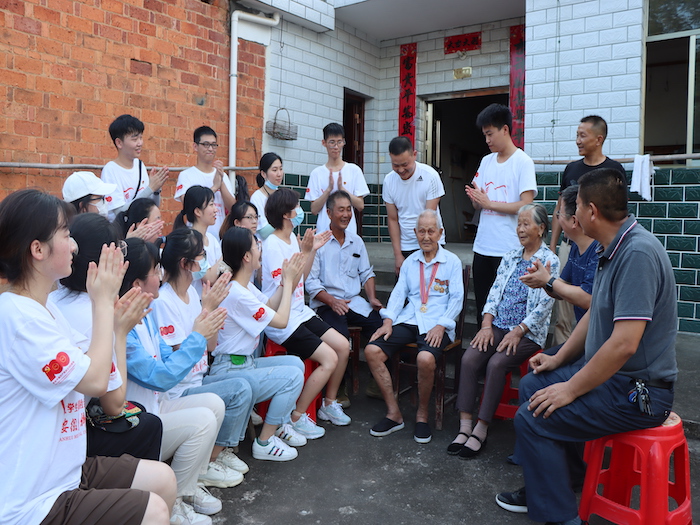 走访抗战老兵,赓续红色血脉。在龙山村抗美援朝老战士王文端的家里,实践队员们送上大米、面条、食用油等慰问品,为他量血压并详细关心他的身体状况,怀着敬仰之情细细观看老战士胸前挂满的勋章。王文端老战士已经92岁高龄,听力衰退,虽然他现在不方便和队员们直接对话,但实践队员们从老战士炯炯有神的双眼中,仿佛依稀能够感受到一名中国抗战军人不畏牺牲、勇往直前的精神品格。“看见老兵祥和的面容,身上挂满的勋章,我感到无比震撼。”2018级临床医学专业学生党员刘欢深情地说道,“作为一名医学生,我们要传承红色基因,赓续红色血脉,努力学习,甘于奉献,用实际行动为国家和社会做贡献。”
