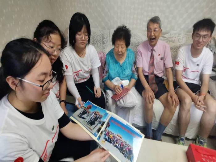 当天下午,队员们来到怀远县委原办公室主任、年近耄耋的中共老党员徐少平家中拜访。徐老党龄超70年,他讲述了自己的入党过程、工作经历以及家庭生活,与队员们轻松的拉家常,时不时发出爽朗的笑声。通过聆听徐老讲述的党史故事,队员们接受了一次直观而深刻的党性教育。