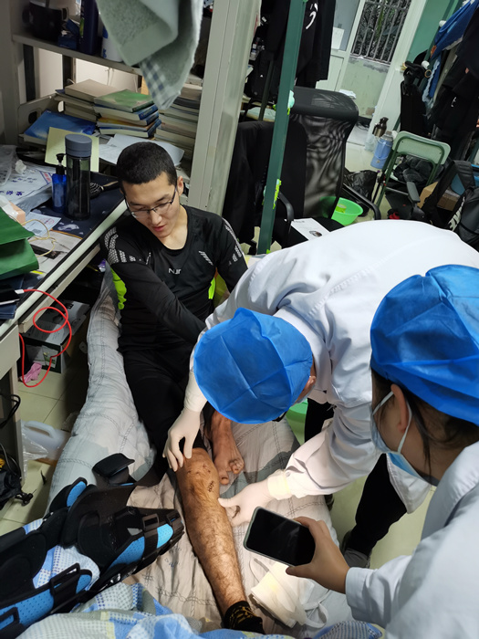 据了解,该生于11月1日在我校第一附属医院进行了交叉韧带重建手术,11月4日出院后返回翡翠路校区宿舍,其辅导员第一时间前去慰问并了解其手术恢复情况,并叮嘱安排该生舍友悉心照顾其起居饮食,但因为其右腿手术后无法弯曲下床行走,换药工作面临着难题。该总支得知这个情况后,立即联系了第二附属医院急诊外科医生孙远松。与总支沟通交流后,在其科室的一名研究生协助下,孙远松11月10日、14日两次上门到该生宿舍,为其腿部伤口进行消毒换药等服务。