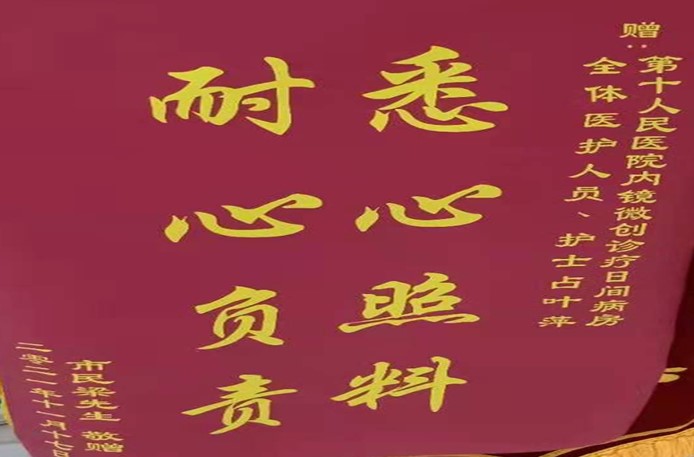 11月中旬,在上海第十人民医院消化二区实习的占叶萍同学,对待工作一丝不苟,在服务某患者时耐心细致向患者及其家属交代了术后饮食、运动、药物方面等的注意事项,在患者住院期间悉心照料,让患者感动在心。患者出院后,患者家属前来医院当面给她送上了“悉心照料,耐心负责”的锦旗。