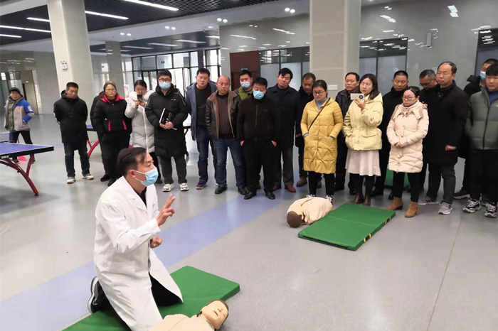 揭牌仪式后举行了合肥一六八中学首届应急救护技能培训班,培训内容主要为心肺复苏理论及实操练习,60余名合肥一六八中学体育教师、生活教师、校医等参加培训。