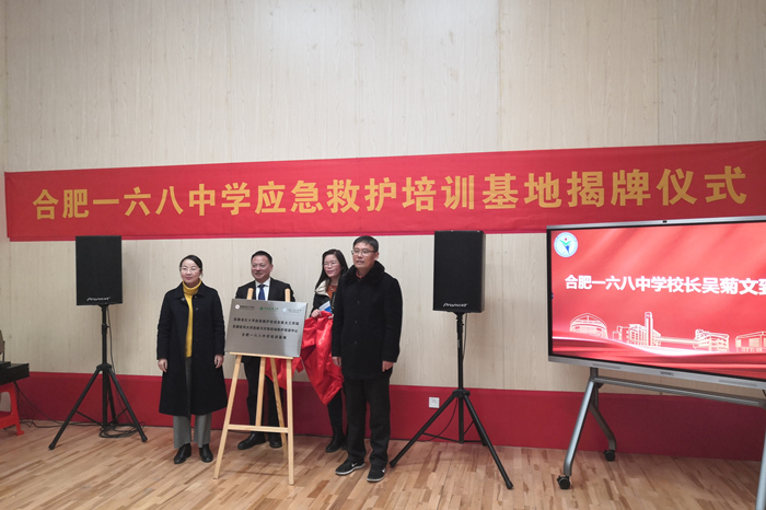 2021年12月30日,安徽省红十字应急救护培训安医大工作站开展应急救护技能培训进中学活动,在合肥一六八中学举办培训基地揭牌暨首届应急救护技能培训班开班仪式。省红十字会备灾救灾中心副主任洪虹、党支部书记高璐出席仪式,合肥一六八中学党委副书记、校长吴菊文及工作站站长汪思应出席仪式并致辞。