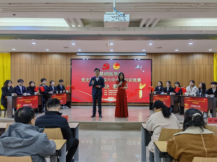 2021年12月31日下午,基础医学院在九楼报告厅举办院党史暨党的十九届六中全会知识竞赛决赛,党委宣传部常务副部长惠继荣、组织部副部长胡鹏、团委副书记杨艳受邀担任评委。该院党委副书记吴热生出席活动。