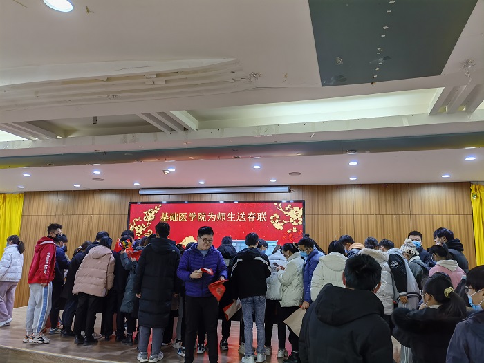 本次知识竞赛决赛有100余名学生参加。为迎接新年,该院教师在活动结束后为同学们赠送了亲手书写的春联和福字,表达了全院老师对广大学子新一年的美好祝福。(基础医学院)