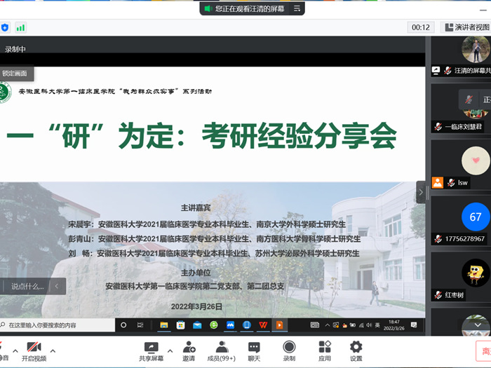 3月26日晚,第一临床医学院以线上会议方式举办考研经验分享会,该院考取南京大学、南方医科大学以及苏州大学硕士研究生的2021届临床医学专业本科毕业生宋晨宇、彭青山、刘畅应邀参加活动。