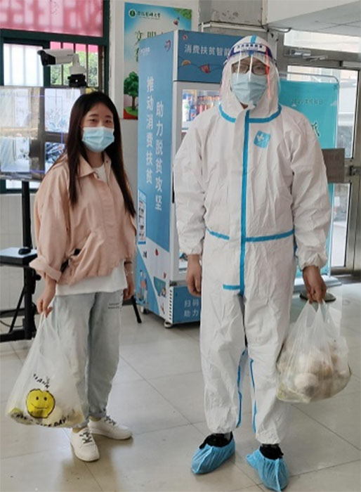 4月20日,校园内出现密接,学校迅速启动应急响应预案,尚美楼3号楼和4号楼共三个楼层封控管理,学生按照规定开始“足不出户”。为了保证每位学生都能吃到热乎饭,研究生辅导员们、导师们纷纷穿上防护服,化身“大白”配送员,将饭菜送到每一个研究生手上,药学院辅导员宋余波每天刚到饭点,就奔忙着把饭菜一袋袋运到不同的隔离楼层,每次送完饭都是一身的汗……