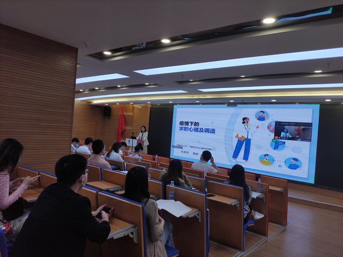朱春燕教授以《疫情下的求职心理及调适》为题,从疫情对就业市场、行业发展、招聘方式和支持系统的冲击等方面,对毕业生当前面临的就业形势与挑战予以全面分析,对毕业生在疫情下求职可能产生的迷茫、焦虑、抑郁等心理状态和盲从、退缩、依赖等行为表现予以详细解读。她为毕业生开具心理调适处方,鼓励毕业生找到自己的就业初心,发掘有利于求职的认知方式、社会支持资源和情绪管理技巧,在求职过程中自信地展示真实的自我,客观地看待求职结果。