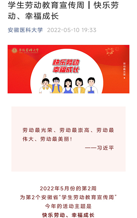 “在安医大校园里,有一群人在默默地用汗水和双手守护你我。劳动是幸福的源泉……”“每一份付出都值得被记录,每一个人都值得被看见。”学校结合“五一劳动节”“学生劳动教育宣传周”等重要时间节点,在新闻网站、官方微信公众号、微博等新媒体平台发布主题宣传海报、专题推送文章等,营造了劳动教育的良好舆论氛围。专题文章聚焦平凡岗位中的教职员工以及助力校园疫情防控的志愿者群体,展现了他们辛勤付出、无私奉献的具体行动,以教育引导广大学子树立“劳动最光荣、劳动最崇高、劳动最伟大、劳动最美丽”的观念,积极培育和弘扬勤俭节约、艰苦奋斗、创新实干、敬业奉献的劳动精神。
