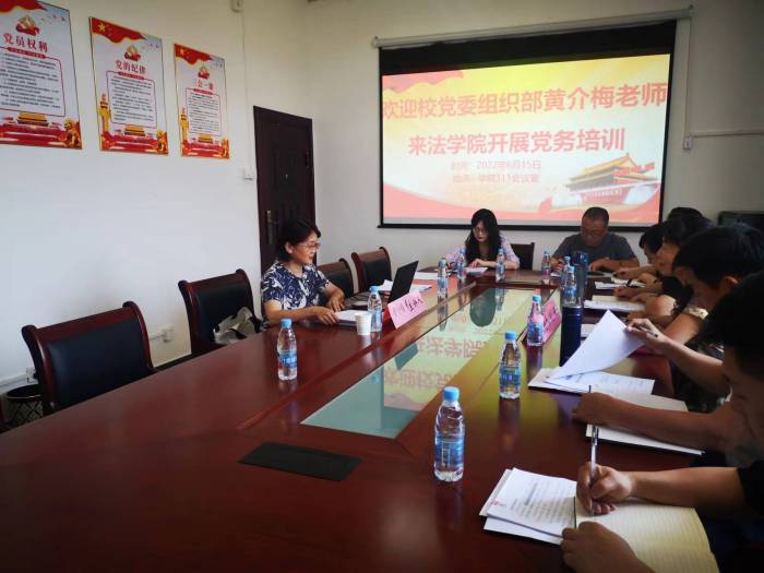 6月15日下午,法学院党委邀请校党委副处级组织员黄介梅,就发展党员工作实务等内容对学院党务工作者进行专题培训。该院党委副书记刘燕主持会议。