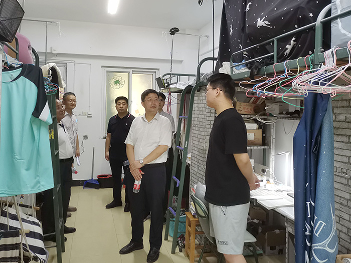 7月8日上午,校党委副书记刘群英一行冒着酷暑走访南校区和东校区,慰问留校师生,深入一线检查校园安全稳定和常态化疫情防控工作情况。