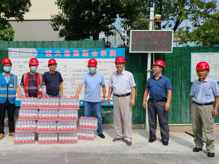 在和平苑二期建设工地,肖圣龙听取了工程施工进度和安全生产情况汇报,实地察看高温期间防暑降温和安全措施落实情况,详细了解一线工作人员的工作、生活情况,代表学校对各参建单位和建设人员表示慰问和感谢,并送上矿泉水等慰问品。他要求相关职能部门及参建单位密切关注高温天气情况,科学调度,做好建筑工地安全生产和疫情防控工作,确保酷暑期间安全作业、安全度夏。
