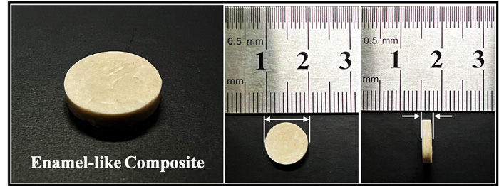 由该院李全利教授、曹颖副教授、郑顺丽副教授带领的牙体组织仿生矿化团队,通过对天然牙釉质的仿生,由线状超长羟基磷灰石以模仿釉柱结构充当无机成分,然后以硅烷偶联剂KH570充当釉柱间的有机基质,通过冷等静压等技术,成功构建了一种3D类釉质复合材料。该复合材料内部HA纳米线呈釉质棱柱状结构,各向异性HA纳米线束密集排列,具有类似于天然釉质的微观结构。同时,这种类釉质复合材料硬度、摩擦性能和酸蚀刻性能与天然釉质相似,直径抗拉强度和抗压强度与一些商用复合树脂相当甚至更好,且具有良好的细胞相容性。该类釉质复合材料有望用于CAD/CAM间接修复的嵌体加工,实现牙体仿生修复。