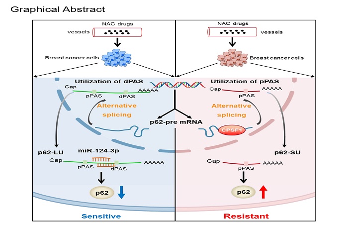 该研究首先对接受NAC的乳腺癌患者的临床肿瘤样本进行RNA测序,并通过实时荧光定量PCR、3'RACE和Northern blot等实验验证,发现了一种新型的p62 mRNA剪切转录本(p62-SU),该转录本携带短3'-UTR,其表达与乳腺癌化疗耐药密切相关。通过一系列体外和体内实验发现,相对于已知的携带全长3'-UTR的p62 mRNA转录本(p62-LU),p62-SU可以显著增强乳腺癌细胞的细胞活力、迁移能力、侵袭能力和化疗耐药性;CPSF1通过可变剪切介导了p62 mRNA的3'-UTR截短。研究证明,p62-SU是通过逃避miR-124-3p的抑制,从而产生更多的p62蛋白,最终导致了乳腺癌的化疗耐药。该研究结果显示CPSF1-p62-miR-124-3p信号通路参与了乳腺癌化疗耐药进程,为认识肿瘤治疗抵抗和靶向治疗提供了新的理论线索。