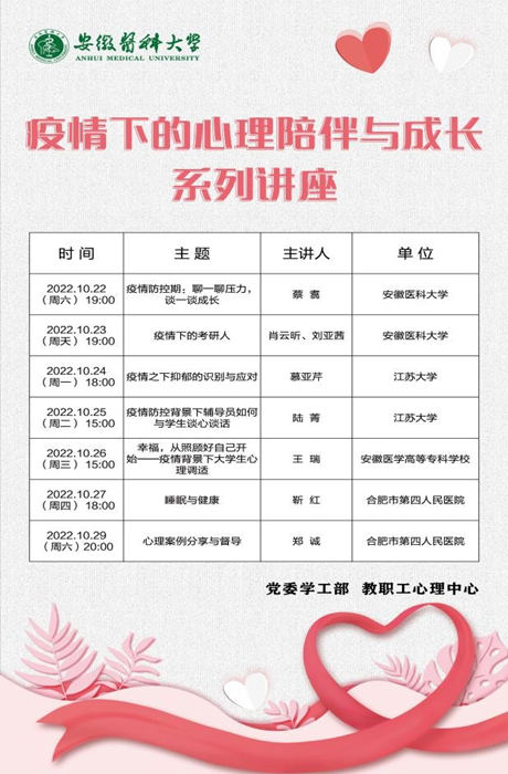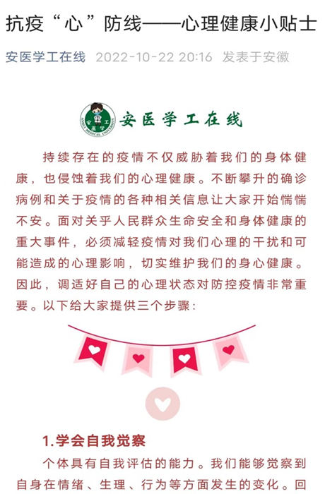 加强人文关怀。“最近总是提不起精神,不知道要做些什么好。”在“心理抗疫”这个特殊的战场上,心理中心专兼职心理咨询师团队成为我校学生不同情绪的“倾听者”与“疏导者”。他们贯穿三个校区,线上线下联动,24小时为学生提供特殊时期心理援助服务,有效帮助学生进行心理调适,并通过“安医学工在线”微信公众号推送心理防疫小贴士,及时引导学生正确看待和接纳自己的心理状态,充分发挥学生“自助、互助、助人”作用,全力创建无疫“心”校园。