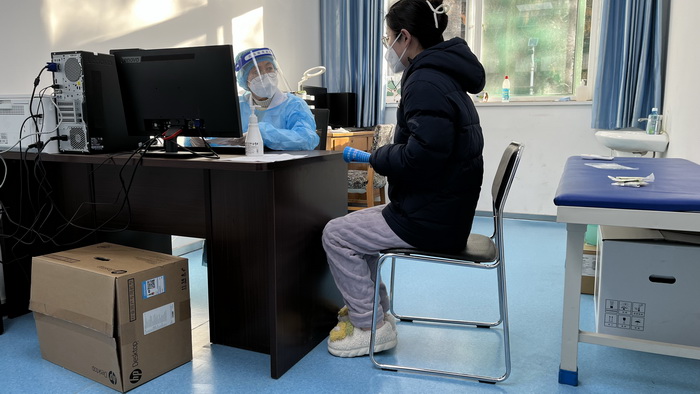 12月16日校医院发热门诊内,内科主治医师丁伟伟正在争分夺秒处置和管理发热学生及阳性患者。接诊患者的间隙,也在不停地接听固定电话和手机给师生提供健康咨询和用药指导,接听了四十多次,一整天都没什么时间吃饭。夜里也不时有发热学生前来,半夜11点40分左右,还在值班的她得知有位研三的学生在寝室发烧至40度,按照流程是其导师或学校老师安排人员带到附院就诊,但是该生导师也阳性,学校老师当时也没有联系上,寝室就她一个人。因为丁伟伟在应急值班室走不开,只能一边联系领导寻求帮助,一边迅速指导学生用药,一整夜,她除了要持续关注楼上隔离观察病情较重同学的病情变化,也在关注着这位同学,一直没敢睡,后来得知该生体温降至低热,才敢休息一个多小时,早上再联系该位同学,体温已降至正常范围。
