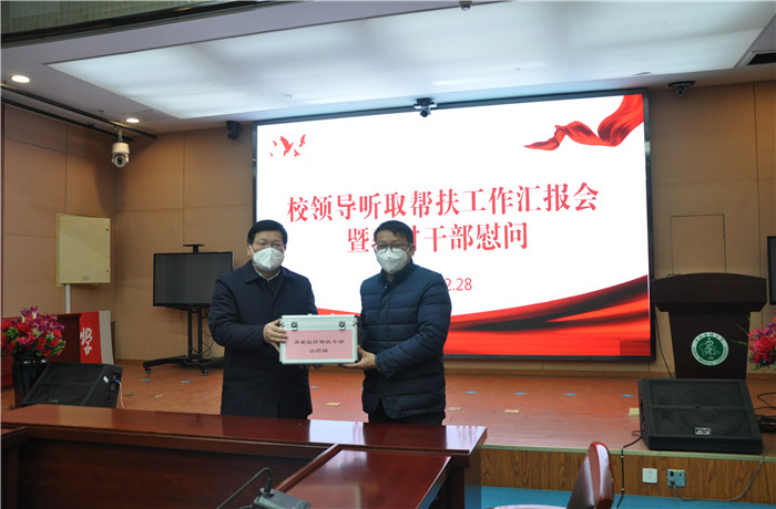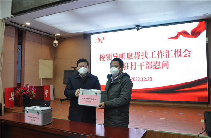 12月28日上午,学校召开驻村帮扶干部慰问座谈会,慰问霍邱县城关镇泽沟村、宋店镇看湖墩村驻点干部。校党委书记顾家山出席座谈会并向驻村干部赠送慰问品。校党委常委、组织部部长李阳新主持会议。