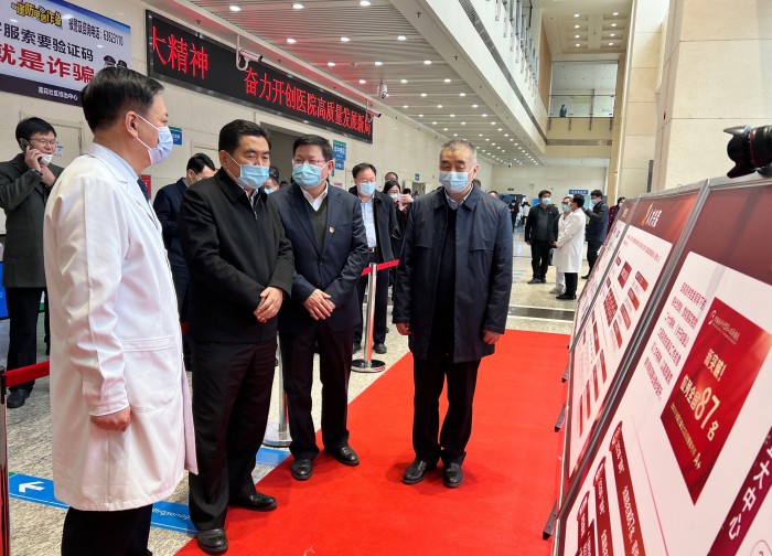 杨建立一行先后参观了二附院党建引领高质量发展、好人榜、先锋榜等系列展览,并深入医院门诊大厅、门诊内分泌科诊室、药物临床试验研究中心等科室、部门进行实地考察与调研。考察中,他听取了医院党建引领高质量发展工作汇报,详细询问了该院结合“六个对标、六个提升”所制定并采取的工作举措以及建设发展所取得的各项成果。每到一处,杨建立都与科室医务人员就党建、医疗、管理等工作进行交流,详细询问基层党支部对于党的二十大精神学习贯彻落实以及支部“三会一课”工作开展等情况,同时还就公立医院如何学习贯彻落实党的二十大精神、怎样通过文化凝聚发展合力等话题与医院相关人员亲切交流并进行指导。