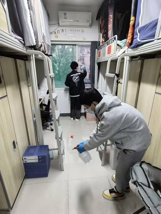 以行促防,防控技能进宿舍。该院以宿舍为单位配备消毒物资,开展寝室卫生消毒和大扫除活动,切实将疾病防控的决心和行动落实到实处,引导学生严格按照宿舍卫生消毒管理标准规范和流程进行喷洒消毒,全面细致地清扫宿舍卫生死角。同时,提醒学生定期对门把手、洗漱台、卫生间、走廊等公共区域进行消毒,做到衣物勤换洗、垃圾常清理,养成良好的卫生习惯,以有效防范春季传染病的侵袭,营造更加洁净舒适的学习生活环境,为创建安全文明和谐友善宿舍打下坚实基础。
