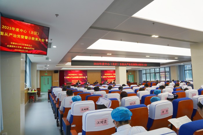 5月10日下午,第一附属医院北区召开2023年全面从严治党暨警示教育工作会议,总结2022年全面从严治党工作,分析研判医院全面从严治党形势,部署2023年全面从严治党工作。该院党委书记戴晓支作题为《一刻不停推进全面从严治党,为推动医院高质量发展提供坚强保障》专题报告,院党委副书记、副院长邓洪禹主持,院纪委书记赵勇传达了省卫健委及学校党委全面从严治党会议精神。