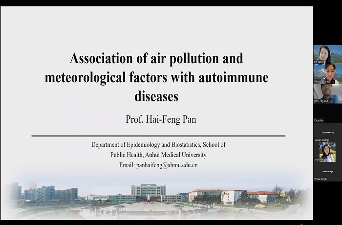 公共卫生学院潘海峰教授、程健教授受澳大利亚著名高校昆士兰科技大学邀请,分别作了题为《空气污染和气象因素与自身免疫性疾病的关系》和《中国日间和夜间高温暴露对精神健康的影响》的学术报告。流行病与卫生统计学系2021级硕士研究生吴柯禺作题为《昼夜温差可能是儿童感染性腹泻发病的危险因素》的报告。三人的研究报告从不同角度探讨了气候变化和空气污染对重点地区和人群健康的影响,并结合我国实际提出了加强气候变化和空气污染协同治理,以达到治理空气污染和减缓气候变化“双赢”局面的可行性措施,为我国当下“碳达峰和碳中和”路径下如何降低区域性空气污染和气候变化的健康危害提供了科学依据。