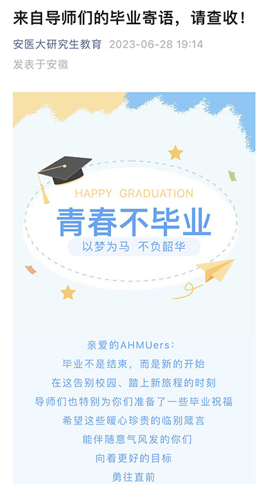 导师毕业赠言,导学思政润物无声。毕业离校是研究生思想政治教育的重要环节,也是思政课教学的延伸载体。学校有效利用研究生离校这一重要时间节点,进一步丰富导学互动平台,助力构建良好导学关系,传扬教学相长、师生相宜的良好导学关系典范。邀请老中青三代研究生导师代表拍摄毕业寄语视频在毕业典礼上播出,一句句亲切的叮咛、一句句美好的祝福,鼓舞着毕业生坚守守护健康、守护生命的医者使命。看完毕业典礼暖场视频后,在场的研究生们都热烈鼓起掌。“导师们的美好祝愿是我们在校的‘最后一课’,却是人生的重要一课。这堂课形式新颖、内容丰富,是对我们的温馨提示,更是对我们走好前行之路的鞭策。我们将牢记母校和导师们的谆谆教诲,走好人生路。”一位研究生毕业生这样说道。