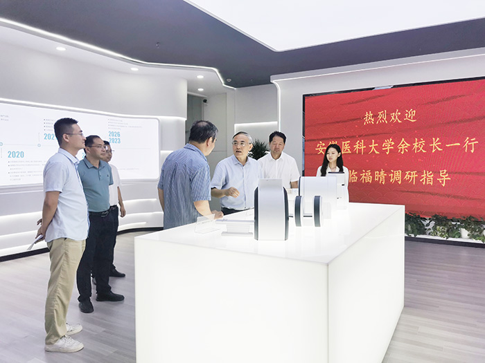 安徽福晴医疗科技有限公司负责人刘孝军代表公司,向余永强一行前来考察表示热烈欢迎。他表示,公司始终秉持为“人类健康服务”的愿景,积极探索“产学研医”四位一体的科研成果转化模式,深入推进“政产学研医金”六位一体的产业发展模式,希望校企双方可以建立多层次多领域合作,共同为大健康产业发展筑势赋能。