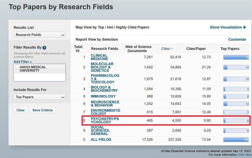 9月15日,科睿唯安发布ESI最新统计数据,我校“精神病学与心理学”(Psychiatry/Psychology)学科首次进入ESI全球排名前1%,这是我校精神病学与心理学相关学科发展取得的又一重要成绩。至此,学校已有临床医学、药理学与毒理学、分子生物学与遗传学、生物与生物化学、免疫学、神经科学与行为学、社会科学总论、环境科学与生态学、精神病学与心理学共9个ESI全球排名前1%学科,在安徽省属高校中位列第一,全省高校中并列第二。