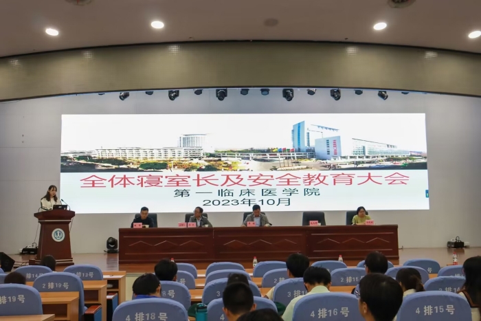 10月20日晚,第一临床医学院在第一附属医院内科医技楼4楼报告厅举行全体寝室长及安全教育大会。该院党委副书记、学生党总支书记李琮出席会议并讲话,该院学生工作部副部长孙民主持会议,院学生党总支副书记高晓妹宣读获表彰的“安全和谐文明友善”学生宿舍名单。